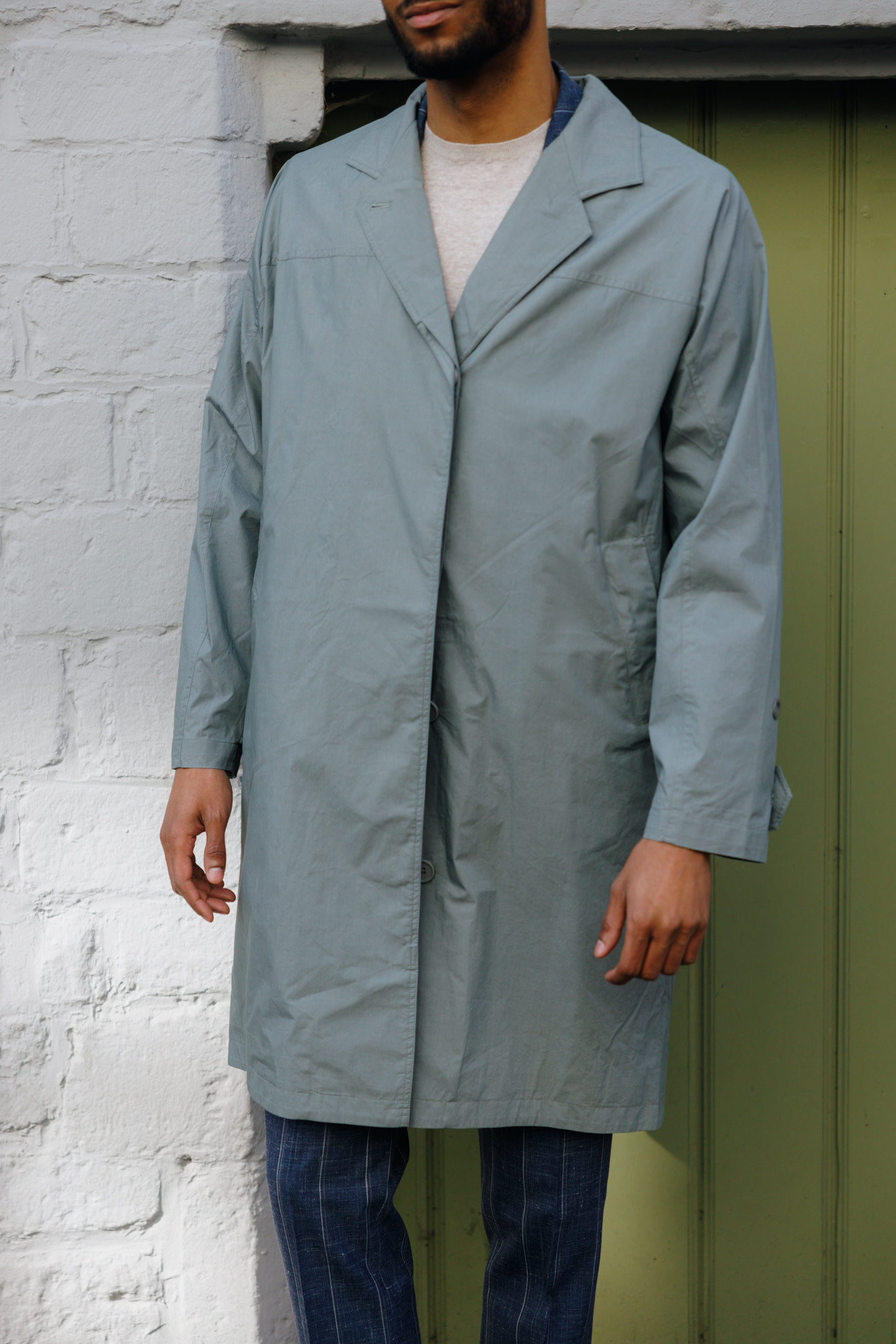 De jas is waterafstotend, ultralicht en heeft een knoopsluiting en grote binnenzakken. Let op de manchetten onderaan de mouwen, met rib om dicht bij de pols te blijven en tegelijkertijd de hand te bedekken door de schuine snit van de onderste mouw.