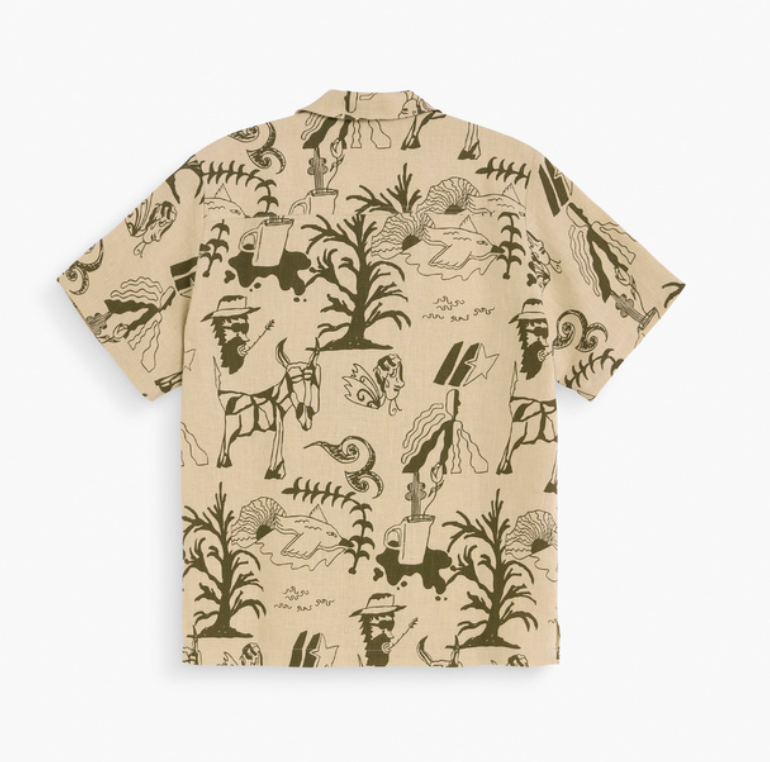 Beige linnen overhemd met surrealistische cowboymotieven en speelse symbolen. Relaxte pasvorm met licht verlaagde schouders.